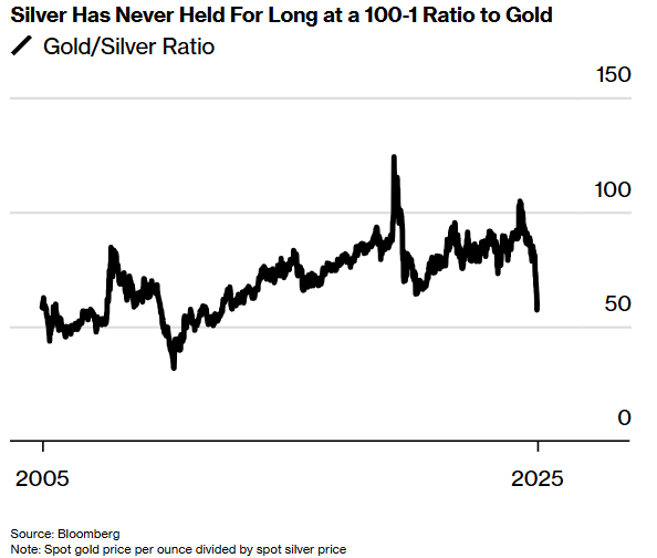 许多投资者也追踪这两种商品的比率。在今年早些时候黄金初步上涨后,金银比一度拉大到 100:1 以上,这向一些投资者发出了买入白银的信号。但最近几周,这一比率已迅速下降。