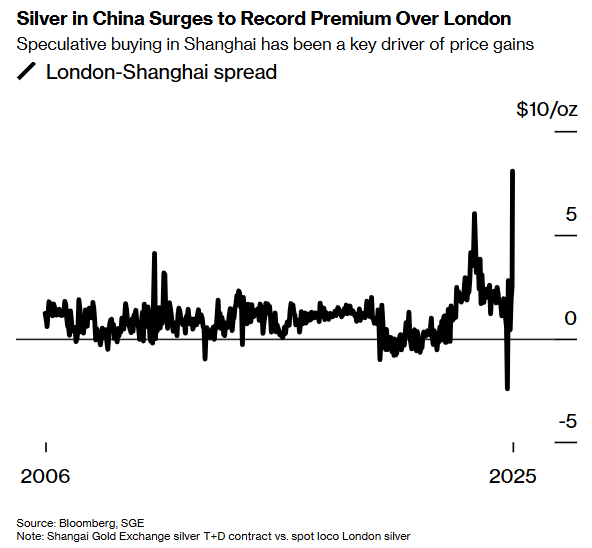 近日中国投资者兴趣激增,是推动白银价格的关键动力。投机者蜂拥涌入这种贵金属,其动态与铂金市场如出一辙。上海黄金交易所白银合约在 12 月的买盘高涨,已将溢价推至创纪录水平,并带动其他国际基准价格上涨。