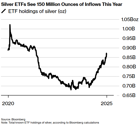 实物支持的白银交易所交易基金 (ETF) 持仓量今年大幅飙升,增加了超过 1.5 亿盎司。这些基金持有的白银总量仍低于 2021 年由 Reddit 推动的散户投资热潮期间创下的峰值,但资金流入在侵蚀本已紧张的市场中的可用供应方面起到了关键作用。