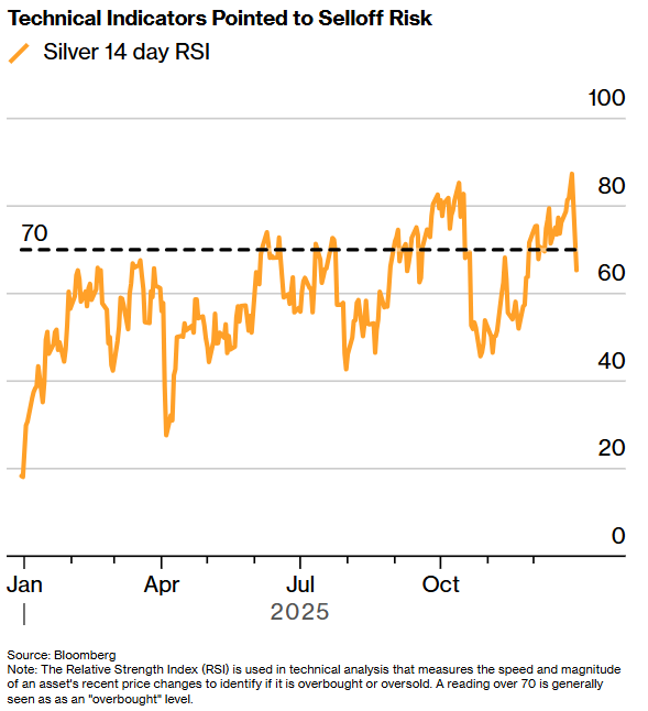 白银的相对强弱指数 (一种衡量买卖动能的指标) 在过去几周大部分时间都保持在 70 以上。读数高于 70 通常表明短期内买入的投资者过多。