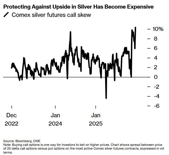 购买白银期货看涨期权的成本相对于购买同等保护价格下跌的看跌期权的成本,近几周也跃升至历史高位。