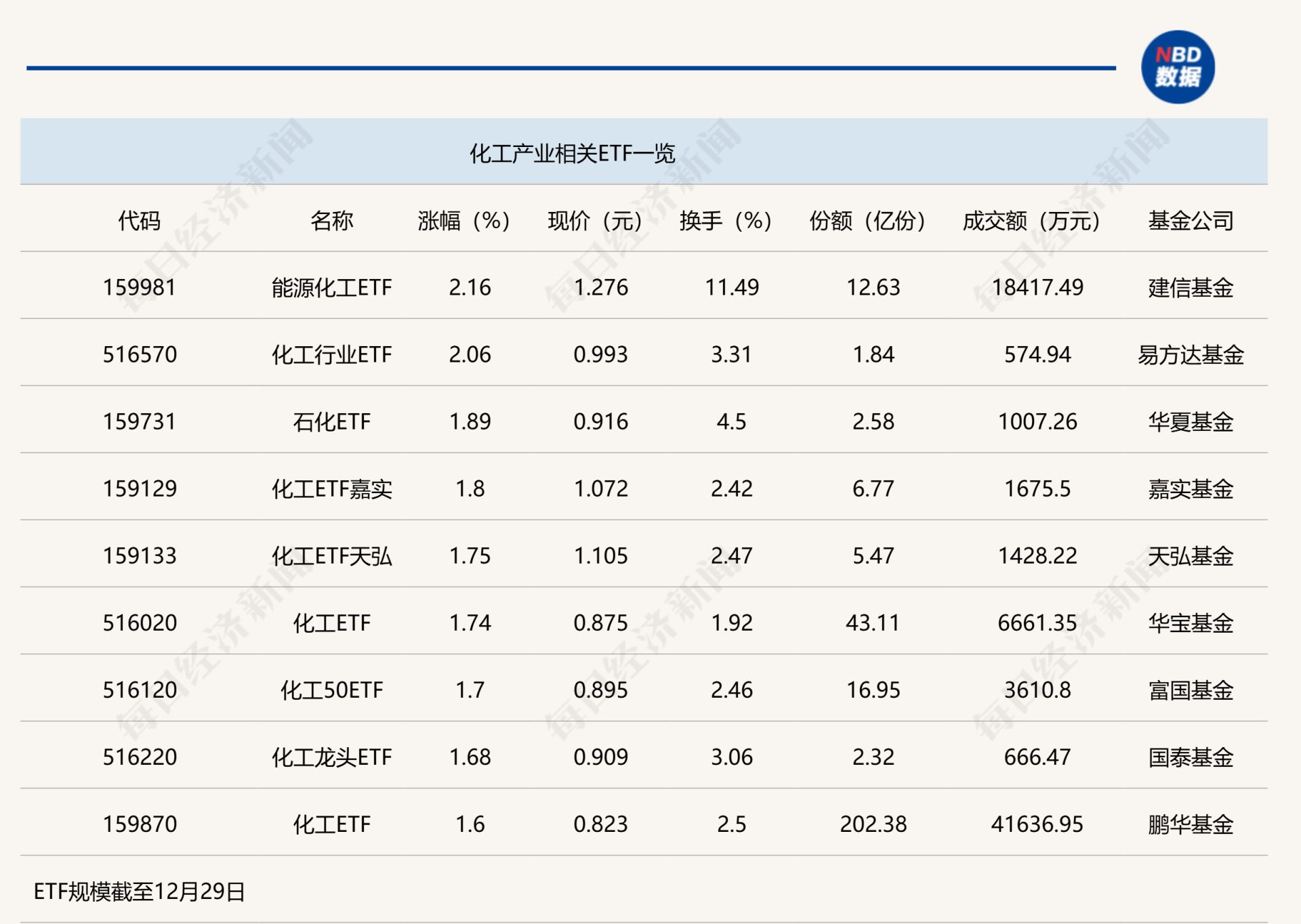 点评:化工 ETF 嘉实 (159129) 今日上午涨幅为 1.8%,其份额为 6.77 亿份,半日成交金额为 1675.5 万元,该 ETF 追踪的是中证细分化工产业主题指数。追踪该指数的 ETF 还包括化工 ETF 天弘 (159133)、化工 ETF(516020) 等。其中,化工 ETF(159870) 规模较大,其份额达到 202.38 亿份,半日成交金额为 4.16 亿元。