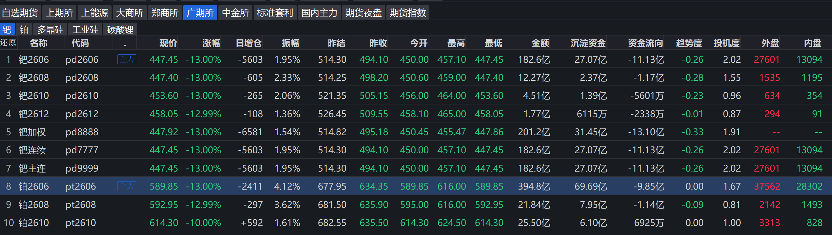 不过随着近期贵金属出现跳水行情,铂钯出现剧烈的调整,其中广期所的铂、钯主力合约连续两个交易日跌停。