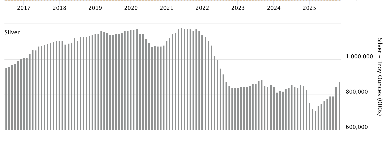 LBMA 数据显示,截至 11 月底,白银库存为 8.74 亿盎司,较上半年的低点 7.11 亿盎司有所增加,但整体仍处于近年来的低位。
