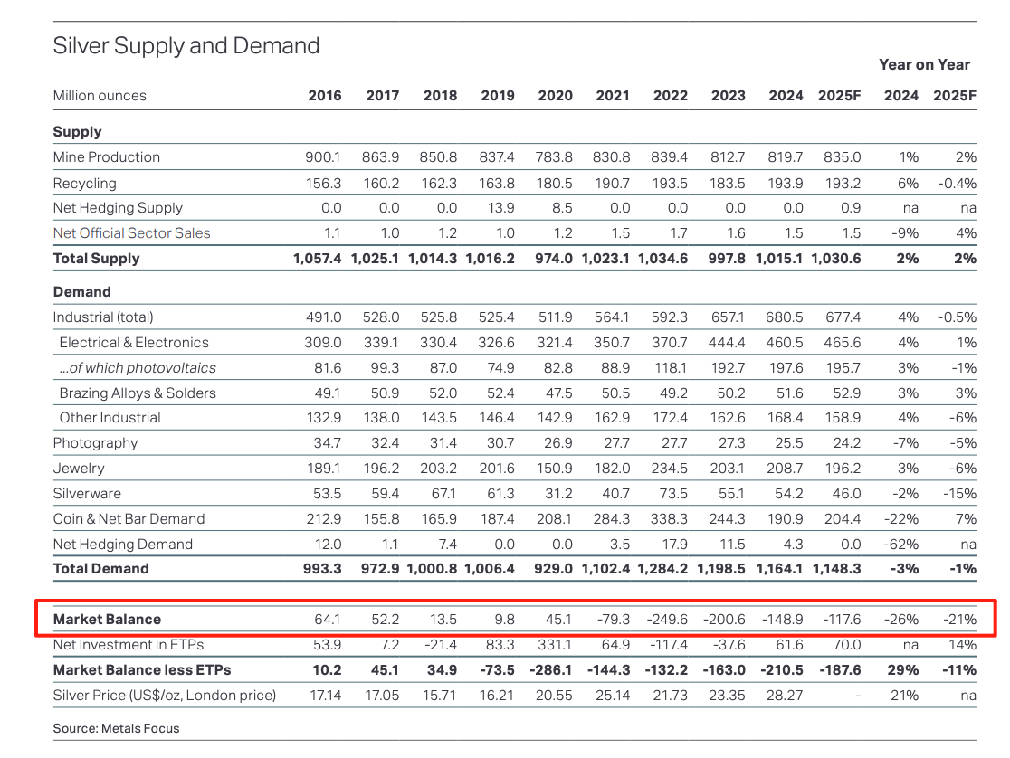(2025 年全球白银缺口预计为 1.176 亿盎司 图源:白银协会)