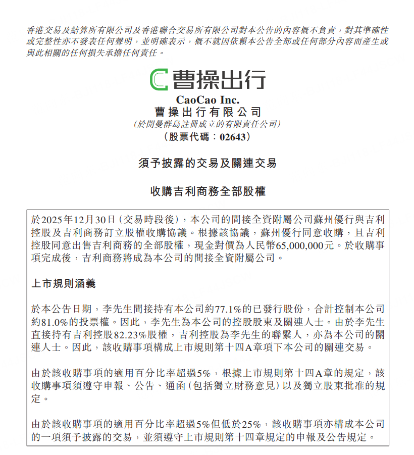 【TechWeb】12 月 30 日消息,曹操出行晚间发布公告宣布两项战略收购:收购蔚星科技有限公司 (下称 「耀出行」)100% 股权,总现金对价 2.25 亿元;拟收购浙江吉利商务服务有限公司 (下称 「吉利商旅」)100% 股权,现金对价 6500 万元。待两项收购事项分别完成后,耀出行、吉利商旅将成为曹操出行的全资附属公司。