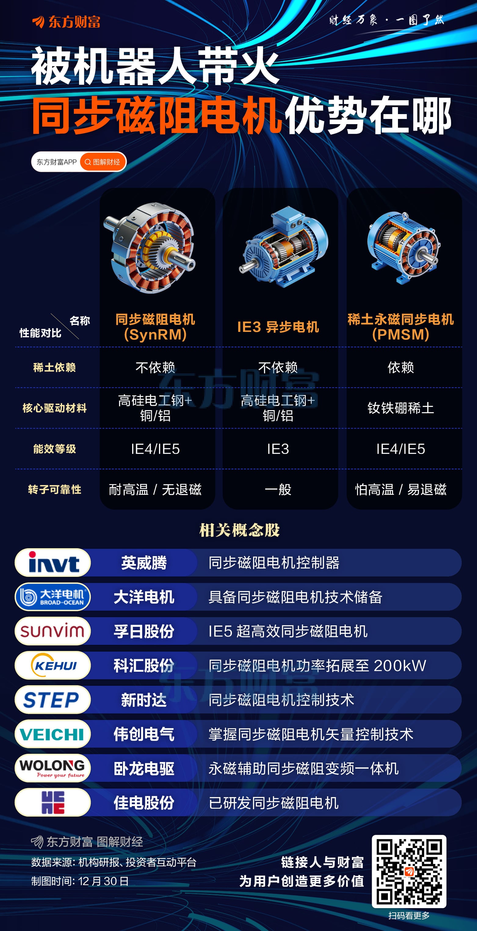 周二 (12 月 30 日) 机器人概念爆发,其分支概念同步磁阻电机概念收盘也大涨超 5%,伟创电气涨超 10%,新时达涨停,卧龙电驱涨超 7%,大洋电机、孚日股份涨超 5%。