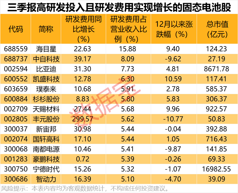 部分固态电池概念股持续重视研发投入,统计显示,三季报研发费用同比实现增长的固态电池概念股中,14 股研发费用占营业收入比例超过 5%,约占总数的四分之一。其中,海目星、中自科技、比亚迪研发费用占营业收入比例居前,分别为 15.88%、8.09%、7.73%。