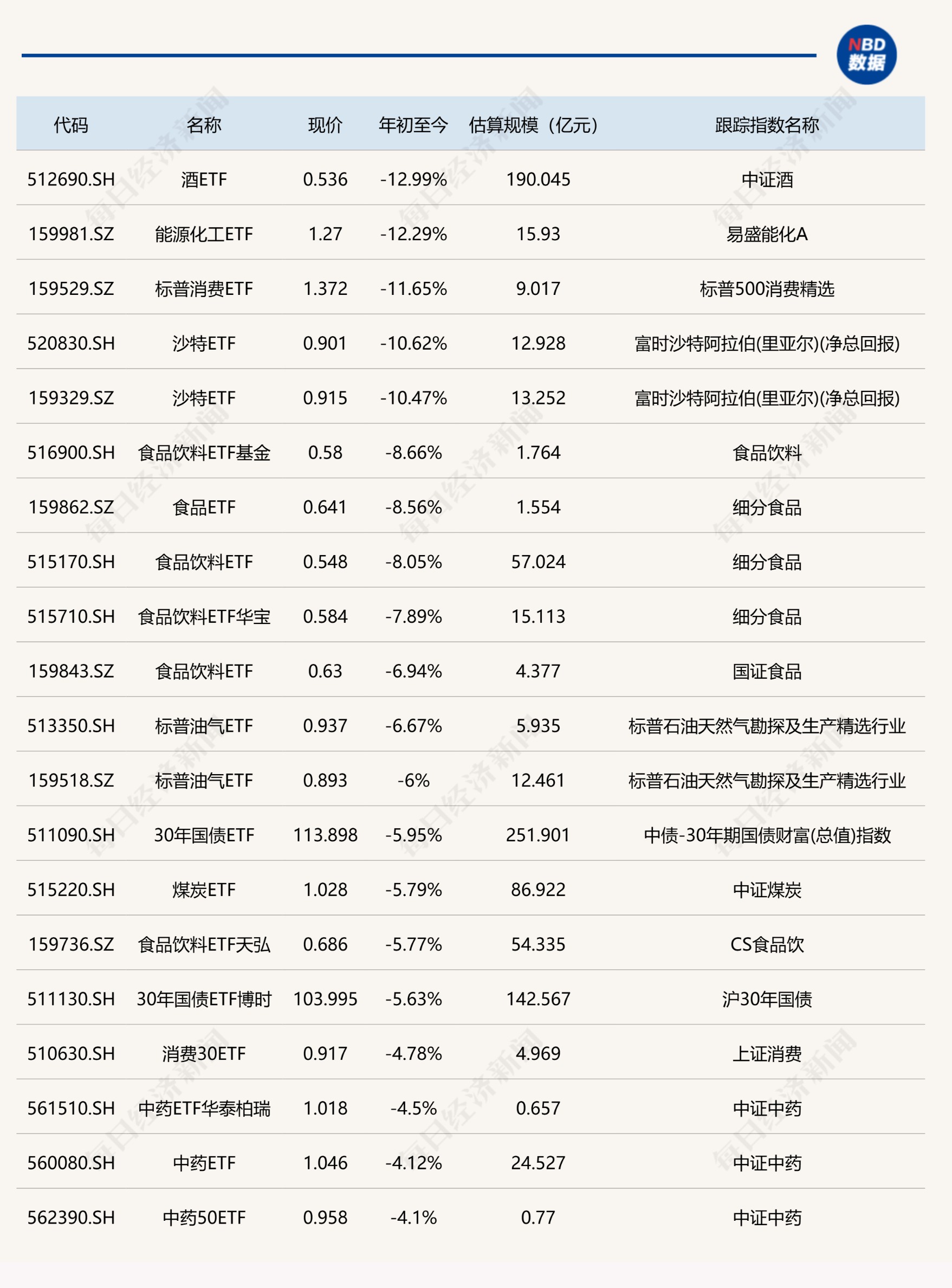 下跌方面,酒 ETF、能源化工 ETF 跌超 12%。跨境 ETF 中的标普消费 ETF、沙特 ETF 跌超 10%。
