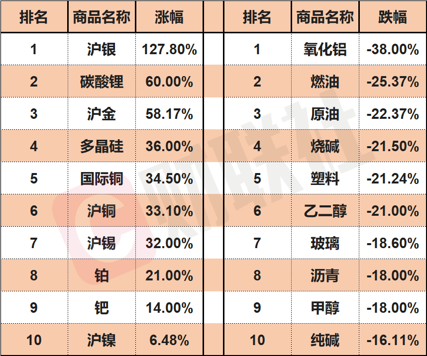 2025 年国内期货市场年度收官,贵金属、有色表现惊艳,地缘政治冲突不断、美联储降息、全球央行增持等因素令沪金、沪银分别以 58.17%、127.8% 年涨幅领涨市场,反内卷与减产消息刺激,碳酸锂触底回升,今年以来涨近 60%,多晶硅涨 36%,国际铜、沪铜分别涨 34.5%、33.1%,沪锡涨 32%,除碳酸锂外均创出上市以来年度收盘新高,焦煤、焦炭触底收出下影线,分别收跌 4%、6.6%。此外,年底上市新品铂、钯期货上演过山车行情,其中铂 12 月份录得 5 个涨停、2 个跌停,最终分别收涨 21%、14%。跌幅方面,受国际原油下跌带动,内盘化工品普跌,氧化铝以 42% 幅度领跌,上期所原油跌 22.37%,乙二醇跌超 21%,烧碱跌 21.5%,玻璃跌 18.6%,纯碱跌 16.11%,沥青跌 18%,塑料跌 21.24%,甲醇跌超 18%。