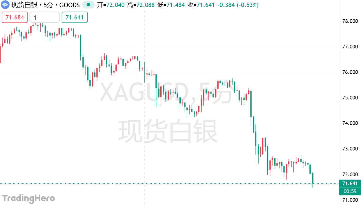 现货白银周二曾大幅反弹收复周一的大部分跌幅,但周三再度上演跳水行情,最低跌破 72 美元关口,截至发稿报 71.58 美元/盎司,日内跌幅超 6%。