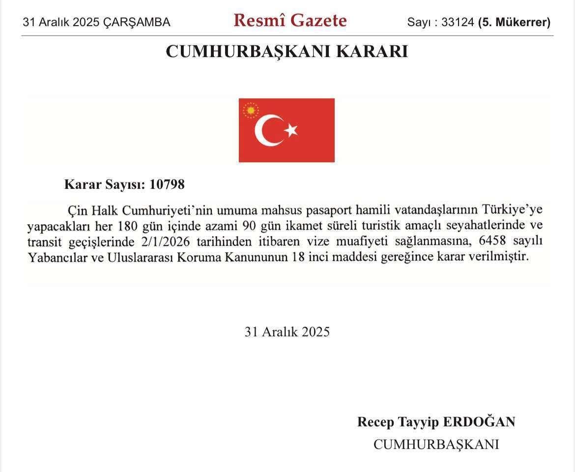 当地时间12月31日,土耳其《官方公报》发布总统令,宣布自2026年1月2日起,对持中国普通护照的公民实行免签入境政策。 根据规定,在每180天内,免签停留时间累计不超过90天,适用于旅游和过境目的。该决定依据土耳其《外国人和国际保护法》第18条作出。(央视新闻) 文章转载自 东方财富