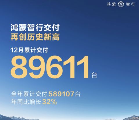 在传统车企参与打造的新品牌方面,鸿蒙智行公布的最新数据显示,2025 年,其全年累计交付约 58.91 万辆新车,同比增长 32%。其中,2025 年 12 月,鸿蒙智行全系产品交付约 8.96 万辆,连续三个月创月度交付历史新高。