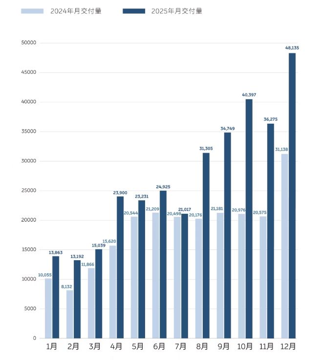 紧随其后的小米汽车,2025 年 12 月交付量超过 5 万辆,这也是其月度交付量首次突破 5 万辆。「2025 年,小米汽车的交付量超过 35 万辆,品牌累计交付量已突破 50 万辆。」2025 年 12 月 26 日,小米集团总裁卢伟冰在小米 17 Ultra 发布会上称。