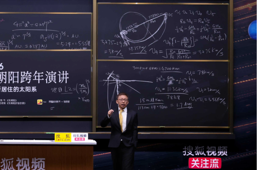 (图注:张朝阳讲解从地球去往火星的航线,上方黑板演算了霍曼转轨,下方黑板演算了逃离地球的轨道。)