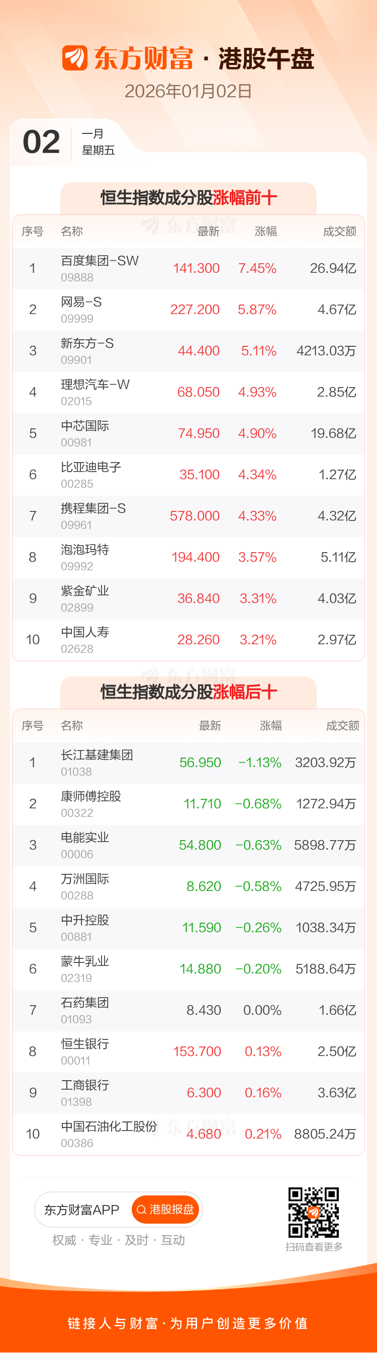 港股 1 月 2 日午盘走高,恒生指数收报 26189.79 点,涨 559.25 点,涨幅 2.18%;恒生科技指数收报 5702.56 点,涨 186.58 点,涨幅 3.38%。恒生指数成分股中百度集团-SW、网易-S、新东方-S 涨幅居前,长江基建集团、康师傅控股、电能实业跌幅靠前。恒生科技指数成分股中华虹半导体、百度集团-SW、金蝶国际涨幅居前。