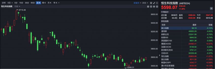 恒生科技指数报 5598.07 点,涨幅 1.48%。