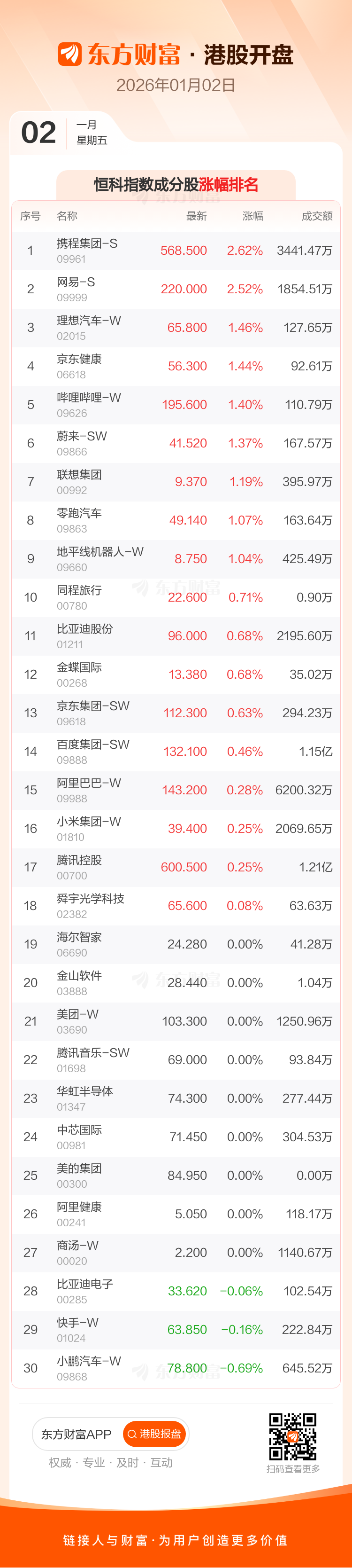 港股 1 月 2 日高开,恒生指数开盘报 25717.42 点,涨 86.88 点,涨幅 0.34%;恒生科技指数开盘报 5547.85 点,涨 31.87 点,涨幅 0.58%。恒生指数成分股中携程集团-S、网易-S、友邦保险涨幅居前,华润万象生活、恒安国际、药明生物跌幅靠前。恒生科技指数成分股中携程集团-S、网易-S、理想汽车-W 涨幅居前,小鹏汽车-W、快手-W、比亚迪电子跌幅靠前。