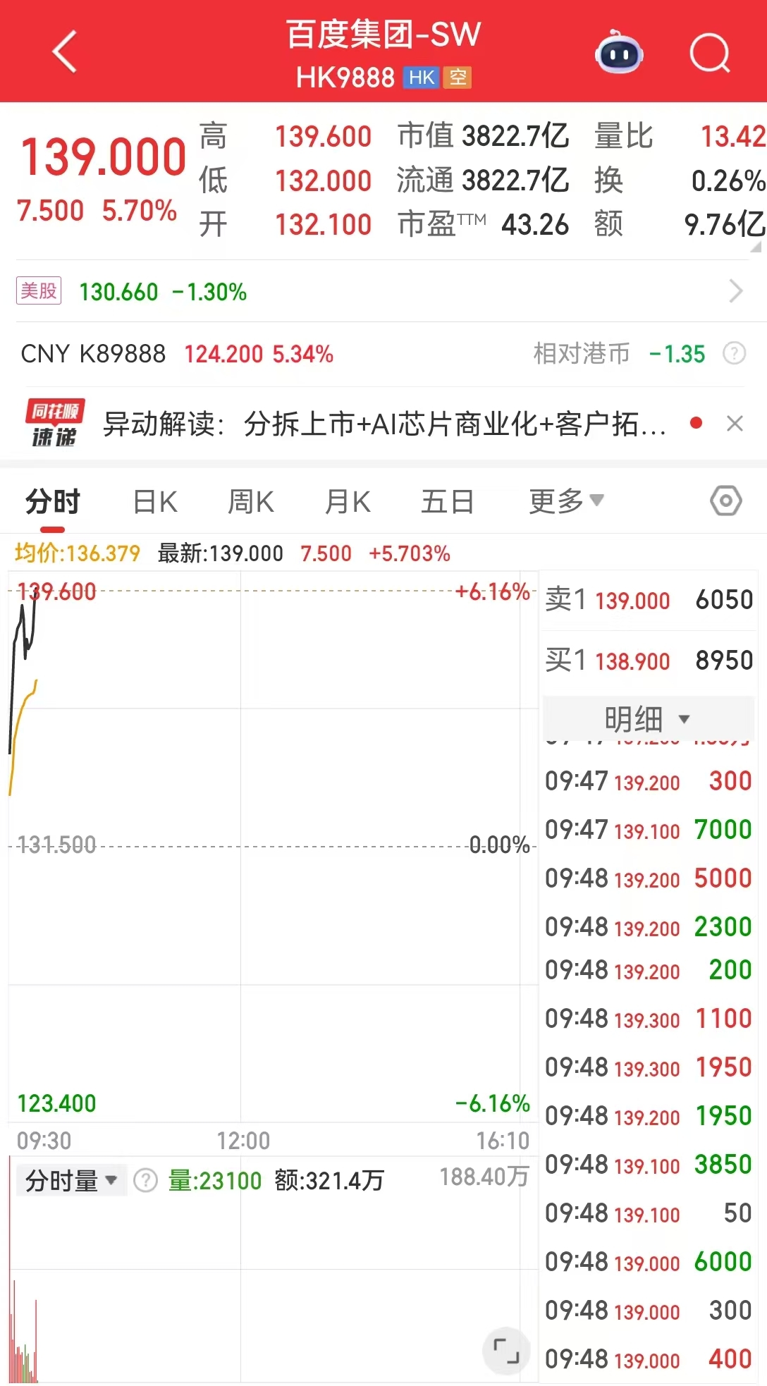 2026 年 1 月 2 日,港股走高,恒生科技指数涨超 2%。当日,「港股 GPU 第一股」 壁仞科技在港交所上市,开盘涨 82%,盘中一度涨超 110%,市值 944.56 亿港元。其公开发售获超 2300 倍认购,募资约 53.75 亿港元。此外,1 月 1 日,百度旗下昆仑芯已提交上市申请,方案包括香港公开发售及向机构投资者配售,分拆完成后预计仍为百度附属公司。