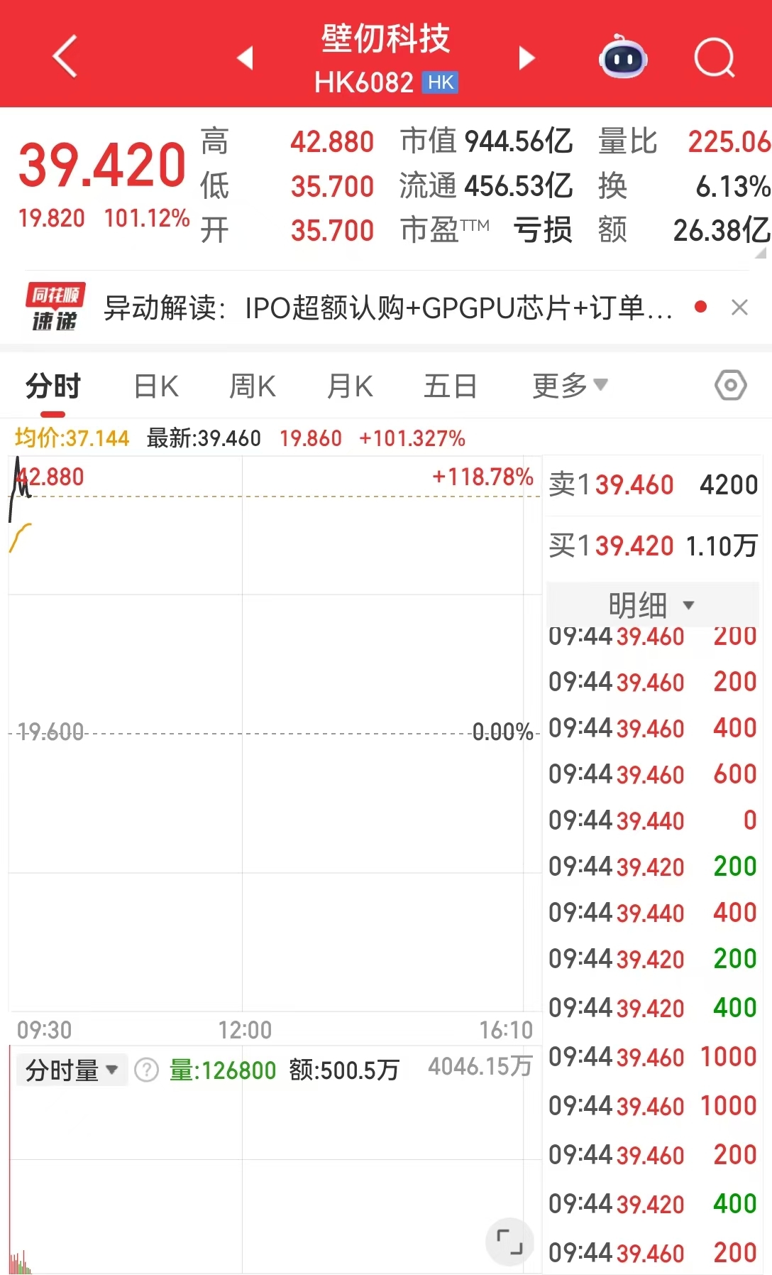 壁仞科技盘中一度涨超 110%,截至发稿,壁仞科技报 39.42 港元,涨幅 101.12%,市值 944.56 亿港元。