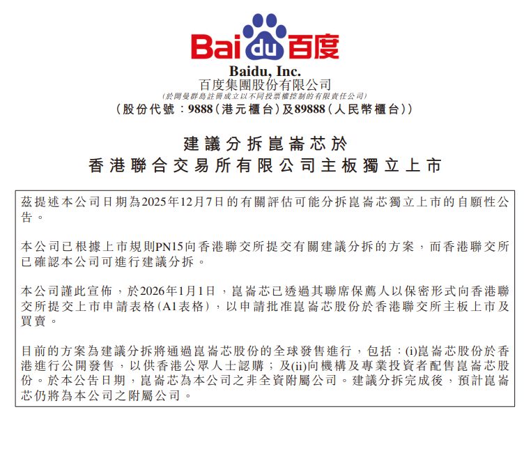 百度港交所公告,1 月 1 日,昆仑芯已透过其联席保荐人以保密形式向香港联交所提交上市申请表格 (A1 表格),以申请批准昆仑芯股份于香港联交所主板上市及买卖。目前的方案为建议分拆将通过昆仑芯股份的全球发售进行,包括:(i) 昆仑芯股份于香港进行公开发售,以供香港公众人士认购;及 (ii) 向机构及专业投资者配售昆仑芯股份。于本公告日期,昆仑芯为本公司之非全资附属公司。建议分拆完成后,预计昆仑芯仍将为本公司之附属公司。
