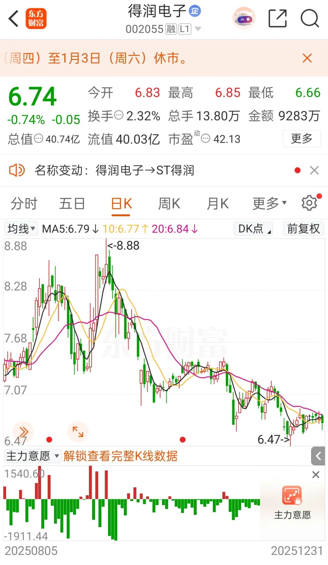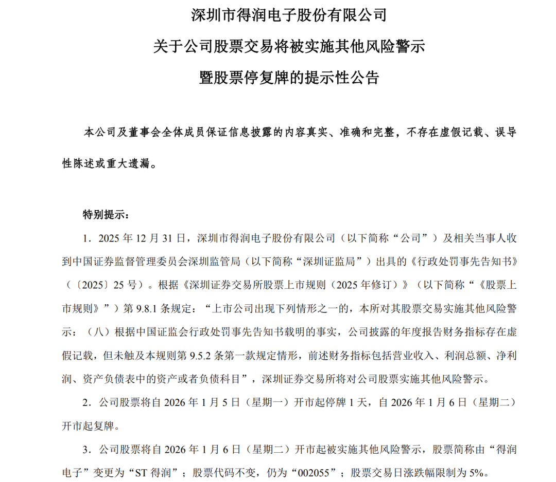 根据公告,深交所将对公司股票实施其他风险警示,股票简称由 「得润电子」 变更为 「ST 得润」;股票代码不变,仍为 「002055」;股票交易日涨跌幅限制为 5%。公司股票将自 2026 年 1 月 5 日 (星期一) 开市起停牌 1 天,自 2026 年 1 月 6 日 (星期二) 开市起复牌。