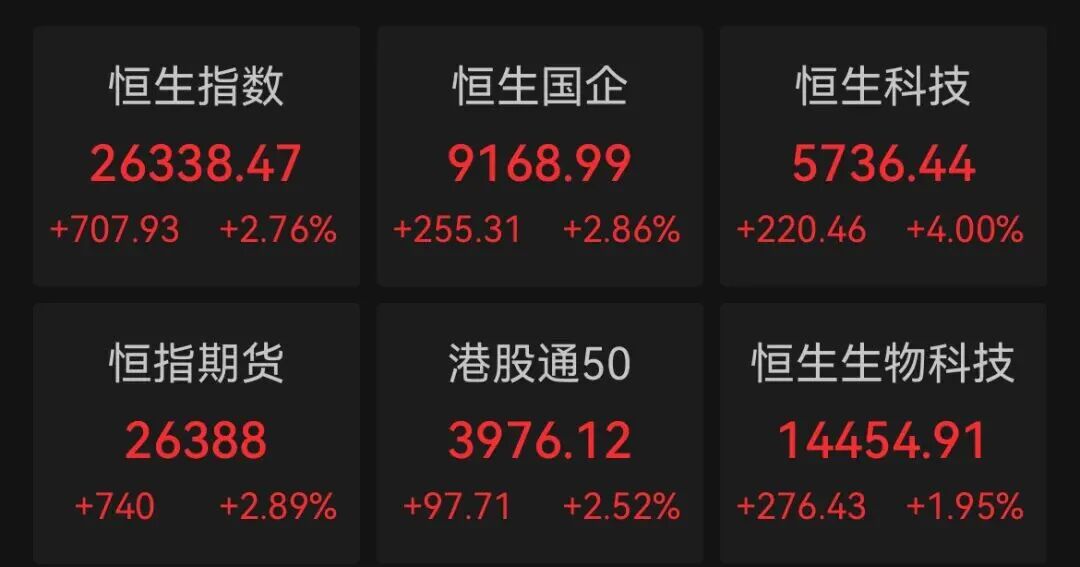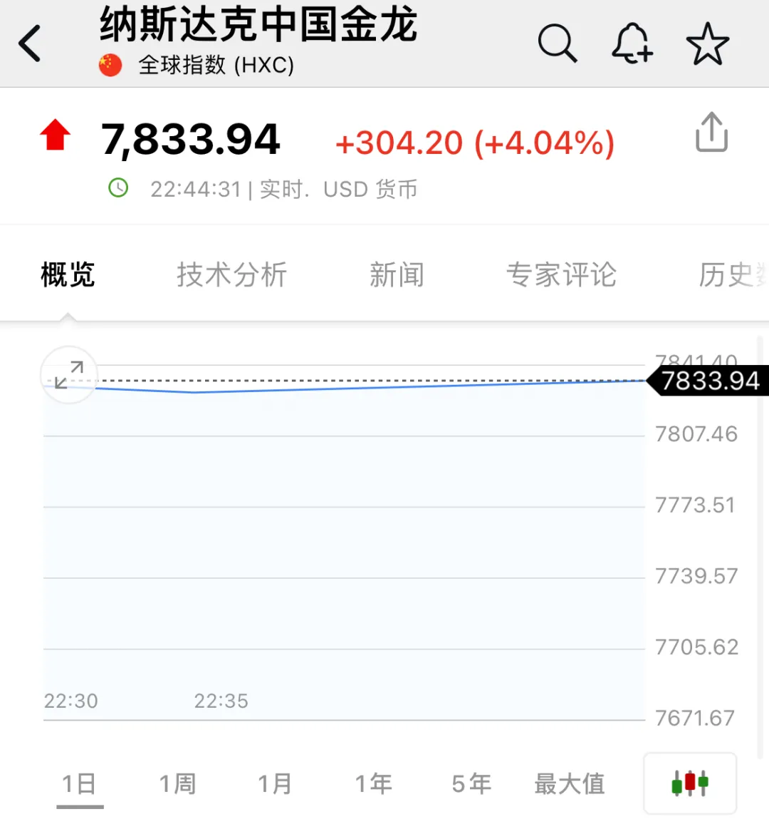 中概股集体大涨,纳斯达克中国金龙指数暴涨 4%,百度涨 11.35%,富途控股涨 6.84%,哔哩哔哩涨 6.87%,网易涨 6.77%,老虎证券涨 5.54%,36 氪涨 4.85%,房多多涨 4.79%,蔚来涨 4.64%,阿里巴巴涨 4.55%,霸王茶姬涨 4.47%,腾讯控股 ADR 涨 4.30%,新东方涨 4.15%,微博涨 3.82%,爱奇艺涨 3.39%,理想汽车涨 3.01%,高途涨 3.02%,贝壳涨 2.79%,迅雷涨 2.82%,京东涨 2.34%。