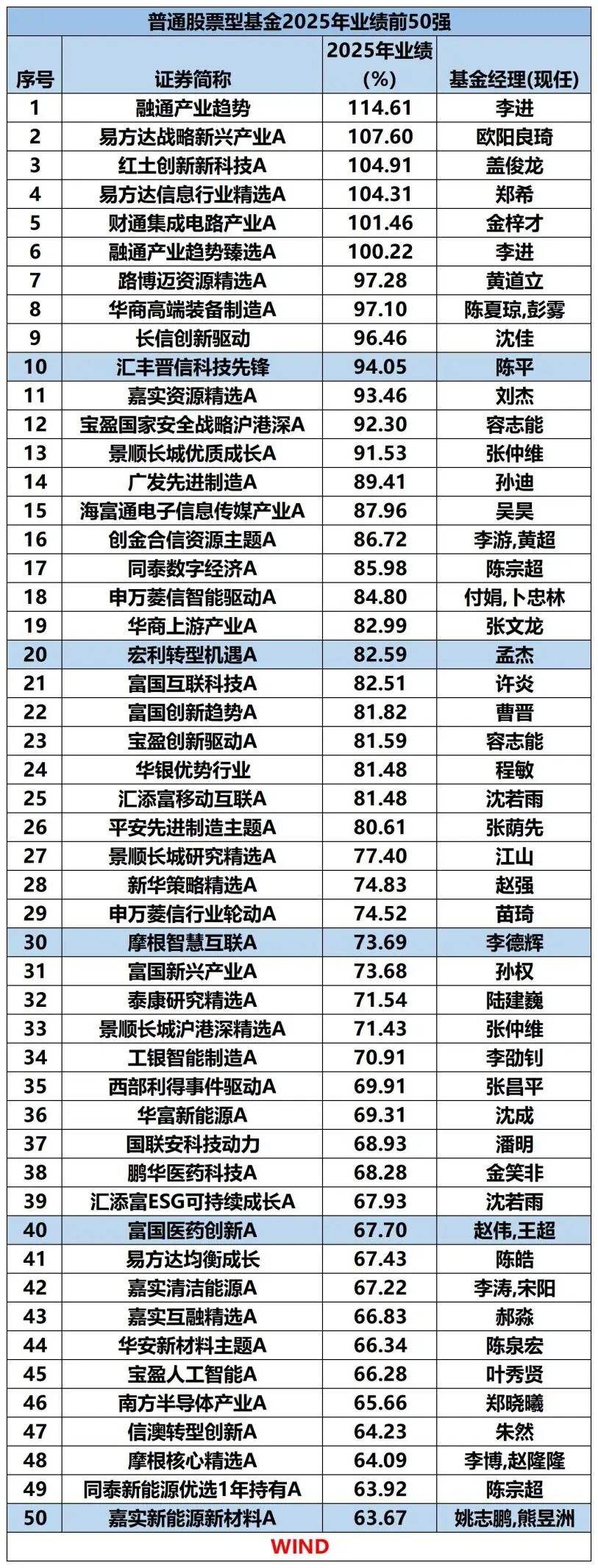 2025 年,普通股票型基金平均斩获 32.53% 的单位净值涨幅,排名前 50 的普通股票型基金 2025 年业绩均超 60%。