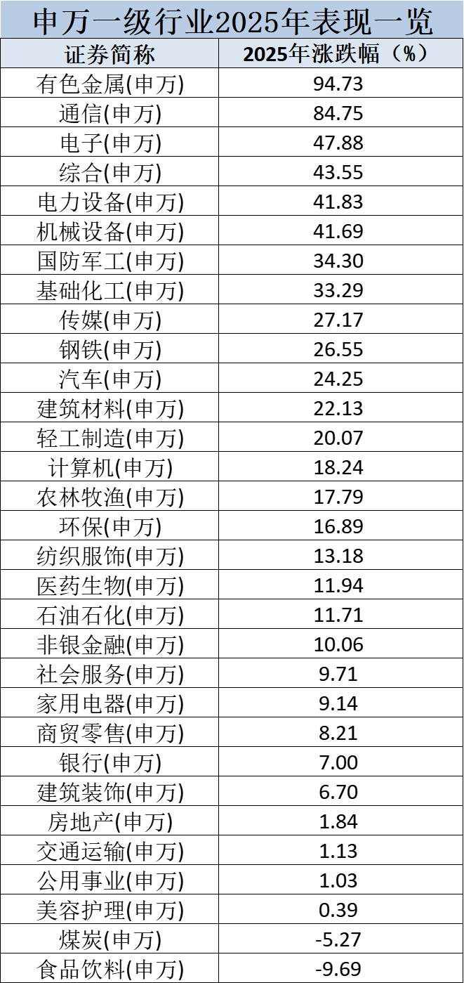 2025 年一些行业或者板块表现突出。从板块表现来看,从申万一级行业来看,有色金属业成为 2025 年表现最好行业,涨幅高达 94.73%,通信行业涨幅也高达 84.75%,此外,电子、综合、电力设备、机械设备等涨幅也超 40%。仅煤炭和食品饮料板块出现下跌,跌幅超过 5%。