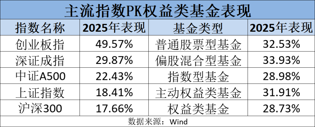 数据统计,若不计算 2025 年成立的新基金,2025 年权益基金整体获得 28.73% 的净值增长率 (包括指数型、混合型、股票型,不含 FOF,仅算主代码),表现明显好于上证指数。