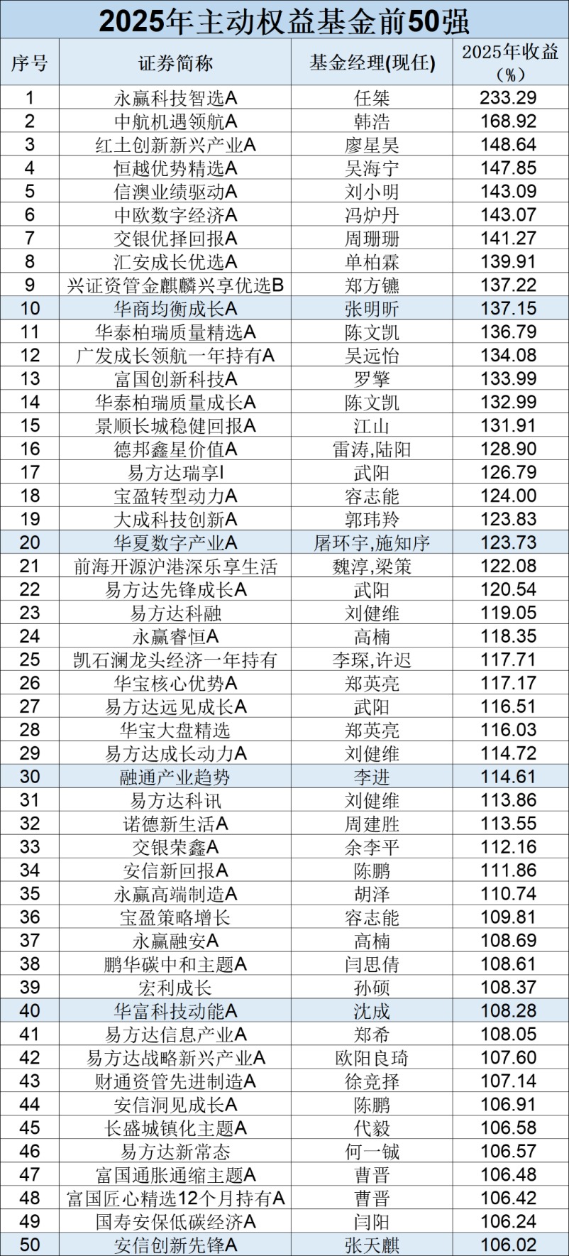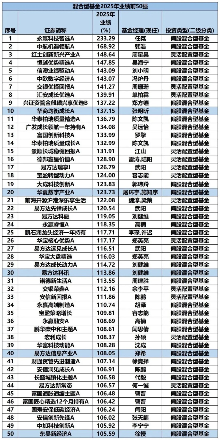 2025 年,混合型基金平均斩获 26.79% 的单位净值涨幅,排名前 50 的混合型基金均是年度 「翻倍基」。