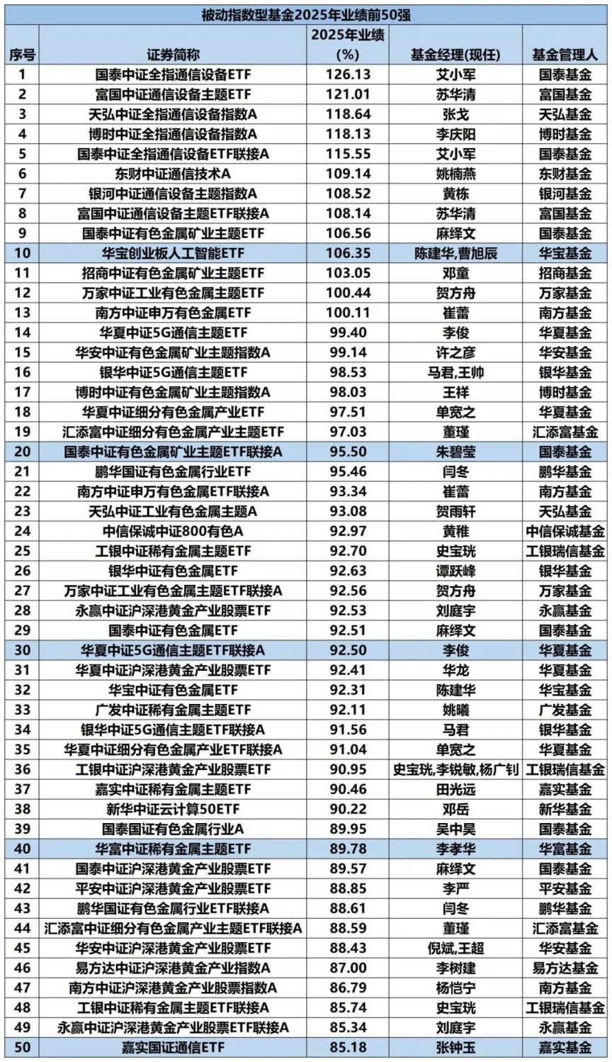 在 2025 年净值增长率前 10 只被动指数型基金中,和通信设备相关的产品 「霸屏」。其中,国泰中证全指通信设备 ETF2025 年业绩高达 126.13%,位居被动指数型基金业绩第一。