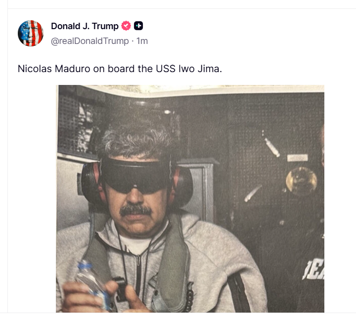 △记者会前,特朗普在社交媒体发布马杜罗在美军舰上的照片