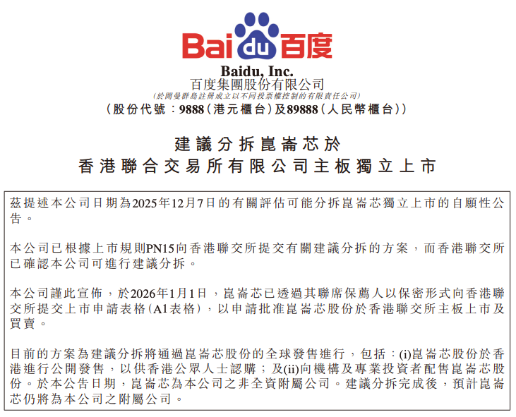 百度在港交所发布公告,宣布 1 月 1 日昆仑芯已透过其联席保荐人以保密形式向香港联交所提交上市申请。公告表明,分拆完成后,预计昆仑芯仍将为百度的附属公司,但具体发售规模与结构尚未最终确定。
