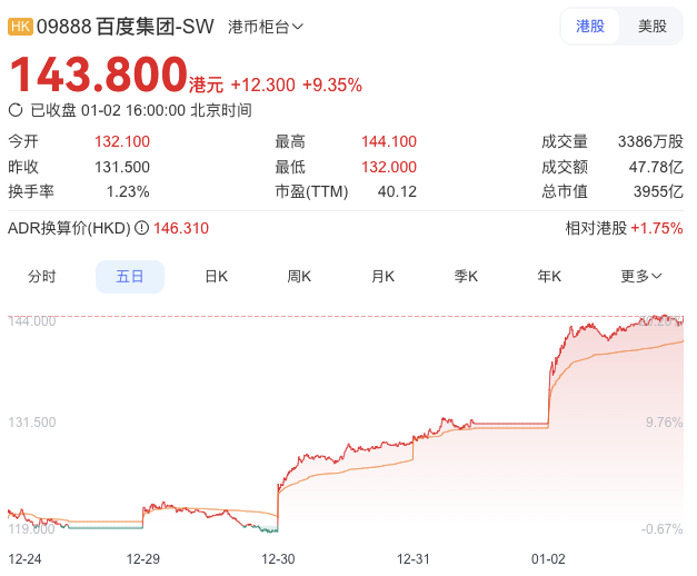 随着分拆昆仑芯上市消息曝出,百度港股、美股均已齐涨多日。截至 1 月 2 日收盘,港股百度股价涨超 143 港元/股,美股则突破 150 美元/股。