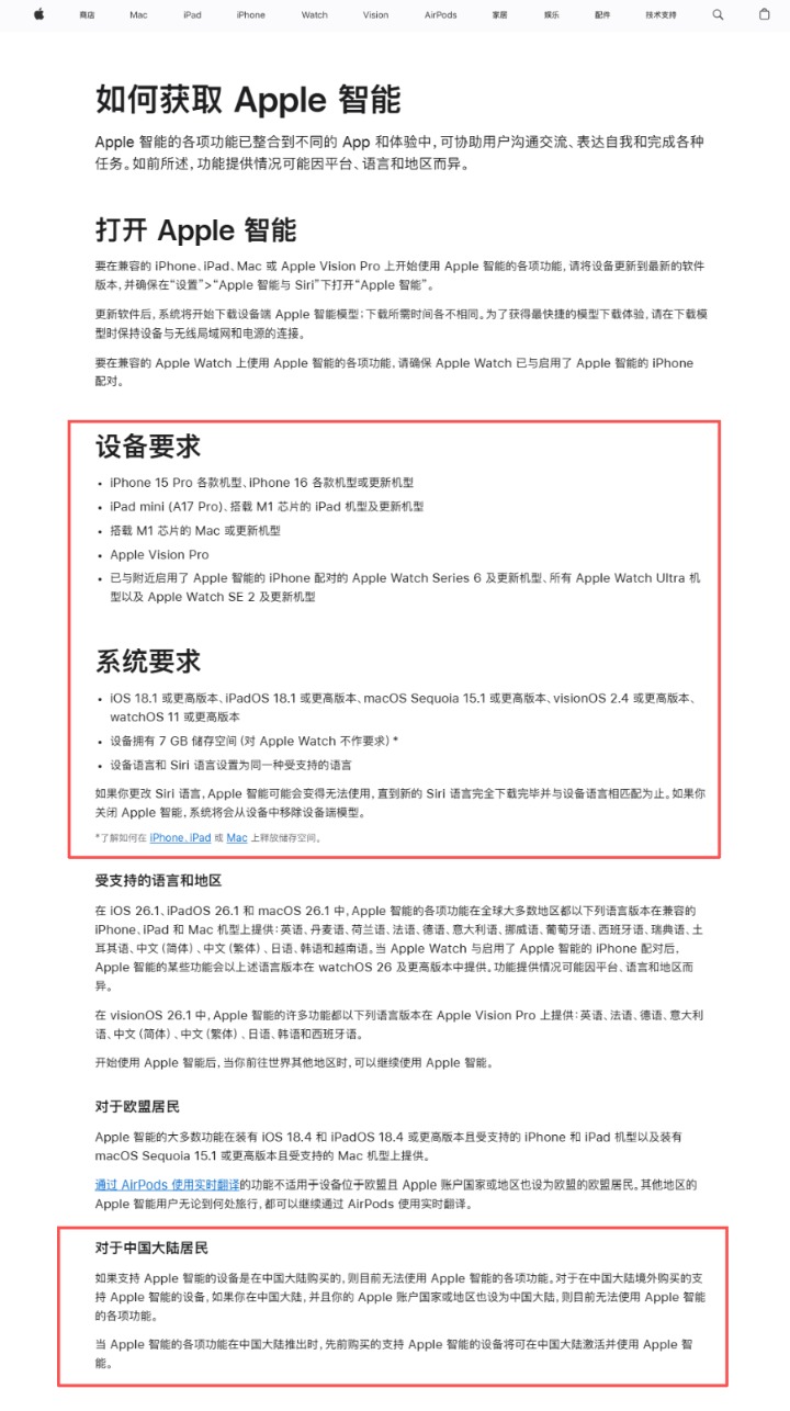 值得注意的是,苹果指出,如果支持 Apple 智能的设备是在中国大陆购买的,则目前无法使用 Apple 智能的各项功能。对于在中国大陆境外购买的支持 Apple 智能的设备,如果使用者在中国大陆,并且 Apple 账户国家或地区也设为中国大陆,则目前无法使用 Apple 智能的各项功能。但当 Apple 智能的各项功能在中国大陆推出时,先前购买的支持 Apple 智能的设备将可在中国大陆激活并使用 Apple 智能。