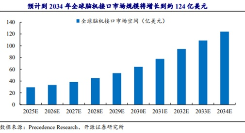 往后看,Precedence Research 数据显示,2024 年全球脑机接口市场规模约 26.2 亿美元,2025 年预计为 29.4 亿美元,2034 年有望达到 124 亿美元,2025~2034 年复合增速有望达到 17.4%,十年规模增长约 322%。