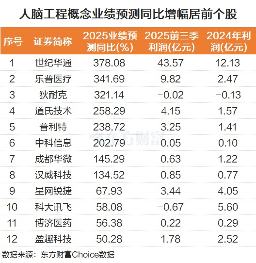 从机构预测的业绩角度来看,部分脑机接口概念 2025 年预计业绩同比大幅增长。比如世纪华通,预测 2025 年业绩同比增长 378.08%。乐普医疗、狄耐克、道氏技术、普利特、中科信息、成都华微、汉威科技2025 年业绩预测也将翻倍。