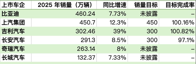 2025 年中国车市收官战报落地,A 股及 H 股上市的六大车企——比亚迪、上汽集团、吉利汽车、奇瑞汽车、长安汽车、长城汽车都先后披露了 2025 年的销量表现。