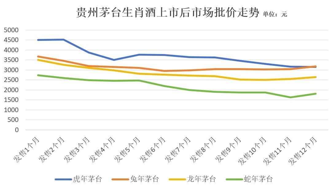 记者统计了解到,每年茅台生肖酒的发布,通常都会带动往年生肖系列产品的市场行情。记者统计近 4 年的生肖茅台酒价格走势发现,产品市场批发价均在上市时来到高点,一个月以后开始回落。