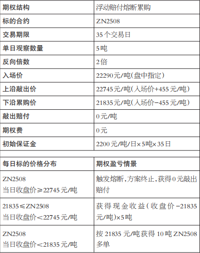 交易入场:2025 年 5 月 29 日,企业正式启动首笔交易。标的合约为 ZN2508,入场价格为 22290 元/吨,价格上限为 22745 元/吨,价格下限为 21835 元/吨。价格区间内,每日观察数量为 5 吨,反向倍数为 2 倍,敲出赔付为 0 元,开仓保证金为 2200 元/吨,交易期限为 35 个交易日。