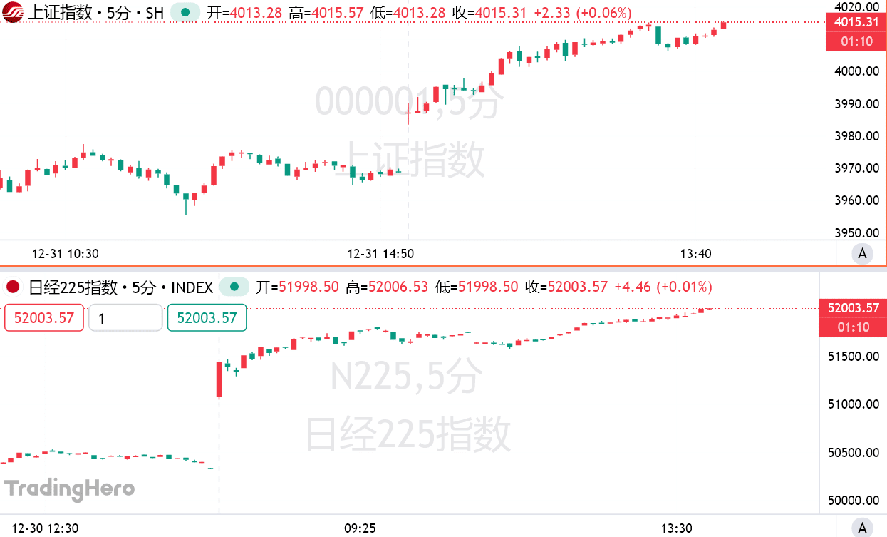A 股亦迎新年开门红,三大指数集体上涨,上证指数盘中重回 4000 点。沪深两市成交额连续第 5 个交易日突破 2 万亿元。深成指午后涨超 2%,创业板指涨 2.5%,沪指涨 1.2%。