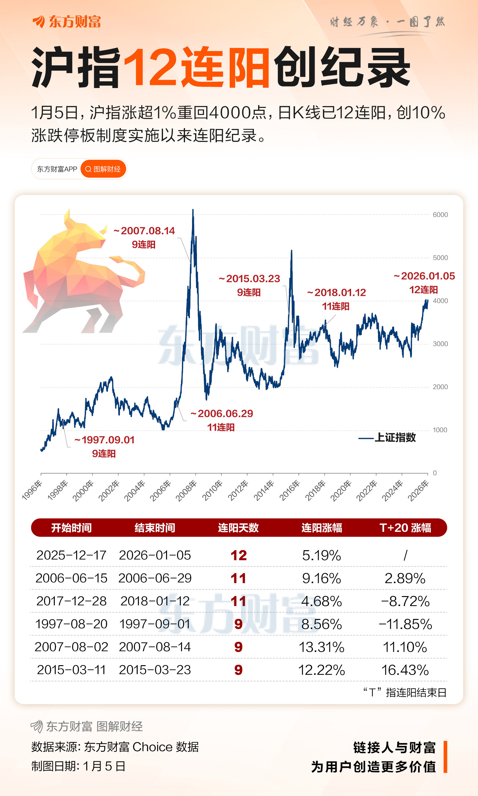 值得注意的是,自 2025 年 12 月 17 日至 2026 年 1 月 5 日,沪指已实现日线 12 连阳,创下自 1992 年 3 月以来最长连阳纪录。回顾历史,1992 年 5 月、2006 年 6 月及 2017 年 12 月至 2018 年 1 月期间,沪指曾三次达成 11 连阳,此次 12 连阳进一步刷新了长达 33 年的纪录。