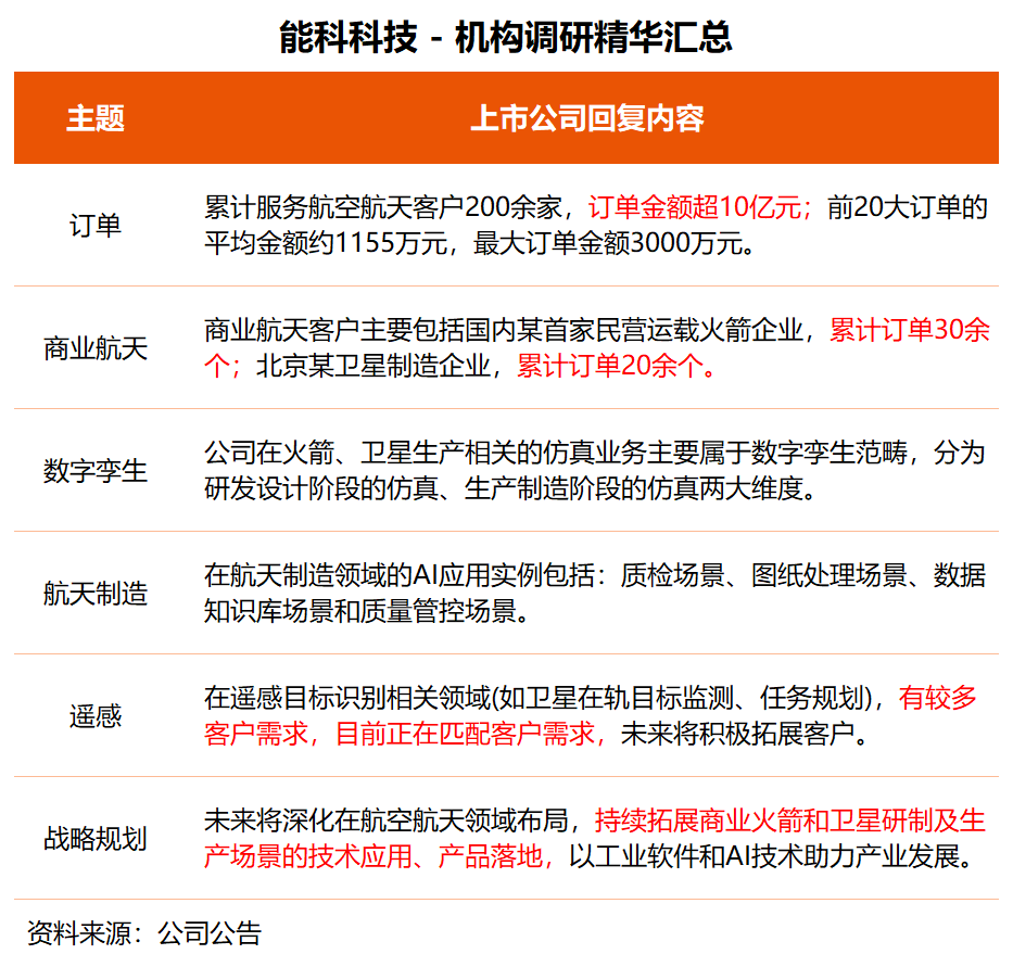 能科科技近日接受中泰证券、西部证券、易方达基金等多家机构调研。公司在调研中透露,截至目前,公司累计服务航空航天客户 200 余家,涉及订单 500 余个,订单金额超 10 亿元;前 20 大订单平均金额约 1155 万元,最大订单金额 3000 万元。其中商业航天客户主要包括国内某首家民营运载火箭企业,累计订单 30 余个;北京某卫星制造企业,累计订单 20 余个。