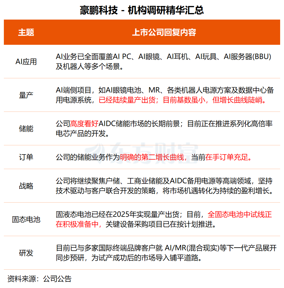 据悉,公司 AI 眼镜电池、MR、各类机器人电源方案以及数据中心备用电源系统已陆续量产出货。豪鹏科技表示,这些项目目前基数虽小,但增长曲线陡峭,代表未来的核心增量。