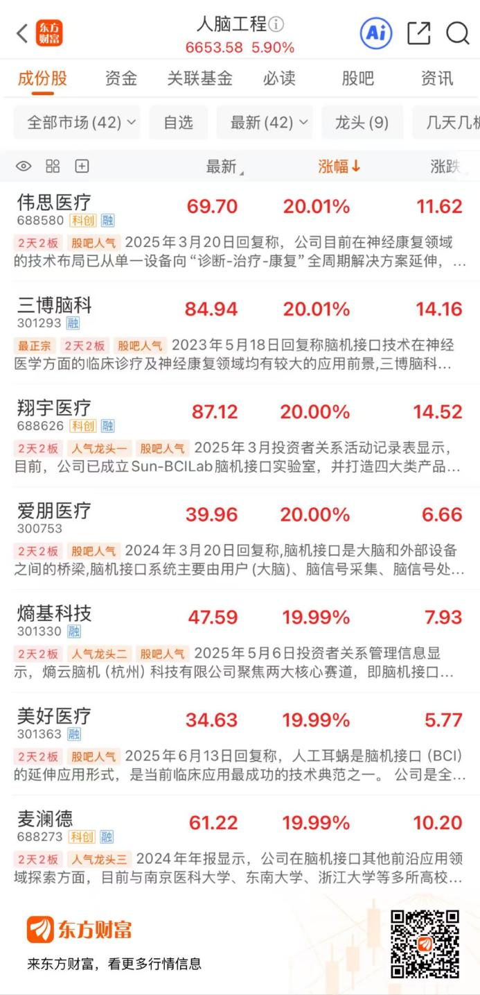 继昨日板块暴涨 13% 后,A 股人脑工程板块 1 月 6 日继续走高,板块内再掀涨停潮。