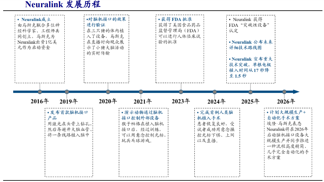 资料显示,Neuralink 是一家侵入式脑机接口企业,旨在开发能够植入人脑的设备,实现人与机器之间的交互,解决医疗康复痛点并探索未来人机融合场景。Neuralink 成立于 2016 年,由马斯克联合多位神经科学家、工程师共同创立。截至 2025 年已完成多例人体植入手术,并不断拓展技术应用场景。