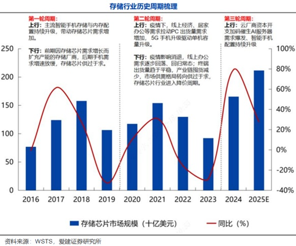 拉长时间看,存储行业也有明显的周期性,且当前正进入新一轮周期。爱建证券表示, 2016~2018 年经历的一轮涨价周期,主要原因来自于智能手机的升级换代。2020~2023 年,线上经济、居家办公等场景拉动了 PC 等终端出货量提升。而后疫情消退,线上办公需求逐步回落、回归常态;终端出货量趋于平稳,产业链囤货减少,市场供需格局转向供过于求,存储芯片行业进入降价周期。