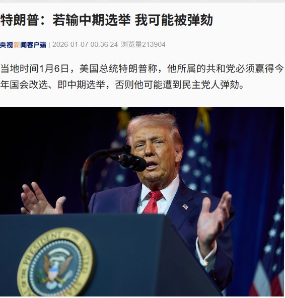 据央视新闻,当地时间 1 月 6 日,美国总统特朗普称,他所属的共和党必须赢得今年国会改选、即中期选举,否则他可能遭到民主党人弹劾。