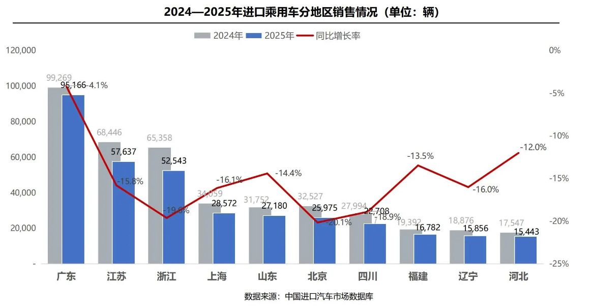 具体来看,2025 年 11 月,进口车前二十品牌中仅有 4 个品牌销量实现增长,雷克萨斯、奔驰和宝马依然稳居前三名。分区域看,2025 年 1 至 11 月,进口车销量前十省份均呈现同比下滑。其中,广东、江苏、浙江销量继续位列前三,而北京销量同比降幅最大,达 20.1%。